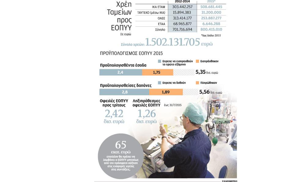 Ειδικότερα, σύμφωνα με τα στοιχεία του ΕΟΠΥΥ, τα ασφαλιστικά Tαμεία του οφείλουν από εισφορές που έχουν εισπράξει από τους ασφαλισμένους ποσό που ξεπερνά το 1,5 δισ. ευρώ, εκ των οποίων τα 800,4 εκατ. ευρώ είναι οφειλές μόνο του 2015 (έως τον Ιούλιο). Δηλαδή, μέσα στο 2015 τα Ταμεία δημιούργησαν μεγαλύτερο χρέος προς τον ΕΟΠΥΥ από αυτό των προηγούμενων τριών ετών αθροιστικά! Μόνο το ΙΚΑ οφείλει το πρώτο επτάμηνο του 2015, από εισπραχθείσες εισφορές ασφαλισμένων 508.681.445 ευρώ, και ακολουθεί ο ΟΑΕΕ με χρέος ύψους 253.887.277 ευρώ. Αυτό έχει άμεση επίπτωση στην πορεία εκτέλεσης του προϋπολογισμού του ΕΟΠΥΥ. Το πρώτο εξάμηνο του 2015 ο ΕΟΠΥΥ θα έπρεπε να είχε έσοδα ύψους 2,4 δισ. ευρώ και έλαβε τελικά 1,75 δισ. ευρώ. Αντίστοιχα, οι προϋπολογισθείσες δαπάνες για το πρώτο εξάμηνο είναι 2,8 δισ. και πληρώθηκαν από τον ΕΟΠΥΥ προς τρίτους 1,9 δισ. ευρώ.