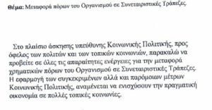 Με έγγραφο του διευθυντή του γραφείου Αναπληρωτή Υπουργού Υγείας, που φέρει τίτλο “Μεταφορά πόρων του Οργανισμού σε Συνεταιριστικές Τράπεζες”, το οποίο εστάλη στο γραφείο προέδρου του ΕΟΠΥΥ στις 11 Αυγούστου, ο Οργανισμός καλείται να προβεί “σε όλες τις απαραίτητες ενέργειες για τη μεταφορά χρηματικών πόρων του” στα εν λόγω χρηματοπιστωτικά ιδρύματα. Σύμφωνα με το έγγραφο, που επισυνάπτεται, “η εφαρμογή των συγκεκριμένων αλλά και παρόμοιων μέτρων Κοινωνικής Πολιτικής, αναμένεται να ενισχύσουν την πραγματική οικονομία σε πολλές τοπικές κοινωνίες”. Χωρίς όμως να διευκρινίζονται ποσά, τράπεζες ή όροι.