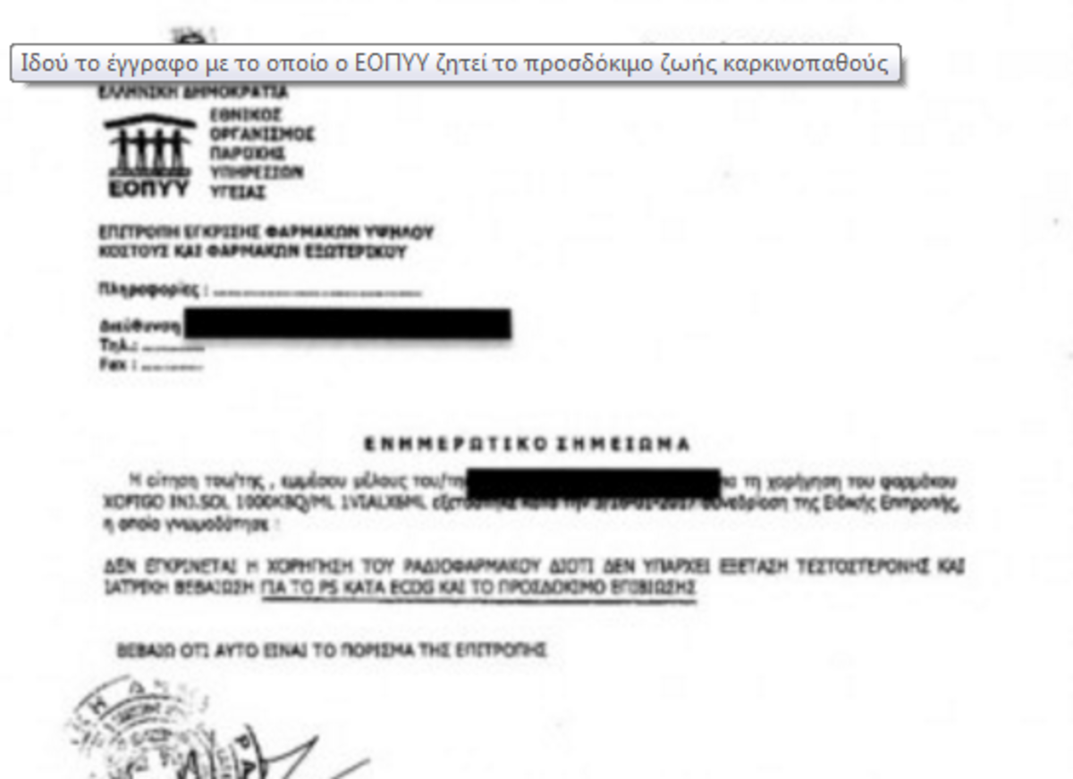Τουλάχιστον μη δόκιμη είχαν χαρακτηρίσει στο iatropedia από την ογκολογική κοινότητα την αναγραφή σε επίσημο έγγραφο του εκτιμώμενου προσδόκιμου ζωής ασθενούς με καρκίνο του προστάτη. Να τώρα που το έγγραφο βγαίνει στην δημοσιότητα και κάποιοι πρέπει να απαντήσουν στο αίσχος!