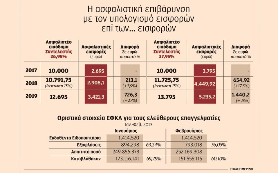Για παράδειγμα, η επιβολή εισφορών επί των... εισφορών, σε εισόδημα ελεύθερου επαγγελματία της τάξης των 10.000 ευρώ το 2017, θα οδηγήσει σε εισφορές 2.695 ευρώ. Επί του νέου διευρυμένου εισοδήματος, οι εισφορές το 2018 θα ανέλθουν σε 2.908,1, ήτοι αύξηση 7,9%, και σε 3.421,3 ευρώ το 2019 (+27%). Στην περίπτωση επιστήμονα με αντίστοιχο εισόδημα της τάξης των 10.000 ευρώ το 2017, οι εισφορές θα είναι 3.795 ευρώ. Το εισόδημα θα... διευρυνθεί το 2018 σε 11.725 ευρώ και οι εισφορές θα ανέλθουν σε 4.449,92 ευρώ (+17,3%), ενώ θα εκτιναχθούν στις 5.235,2 ευρώ το 2019 (+38%), καθώς το εισόδημα θα υπολογιστεί στις 13.795 ευρώ.
