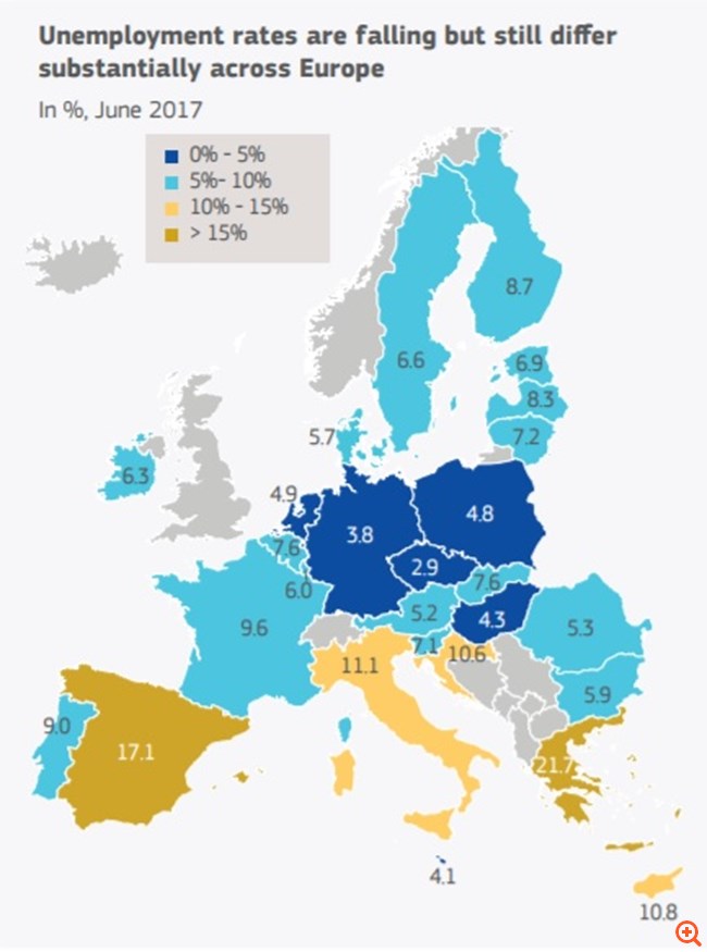 Σύμφωνα με τα στοιχεία που χρησιμοποιεί η Επιτροπή ως μέτρο αποτίμησης της "εξόδου" από την κρίση, η ανεργία στην Ελλάδα φτάνει στο 21,7% του εργατικού δυναμικού, στα υψηλότερα επίπεδα ανά την ΕΕ, όταν ο μέσος όρος στα κράτη - μέλη υποχώρησε στο 9,1% στα χαμηλότερα επίπεδα από το 2009.