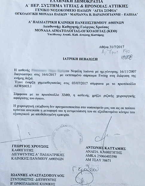 Σύμφωνα με αυτές, η επέμβαση αφαίρεσης όγκου που χρειάζεται η μικρή Νεφέλη, μπορεί να γίνει στο Νοσοκομείο Παίδων “Αγλαΐα Κυριακού”, ακριβώς δίπλα, δηλαδή, από το "Αγία Σοφία" όπου νοσηλεύεται μέχρι σήμερα.