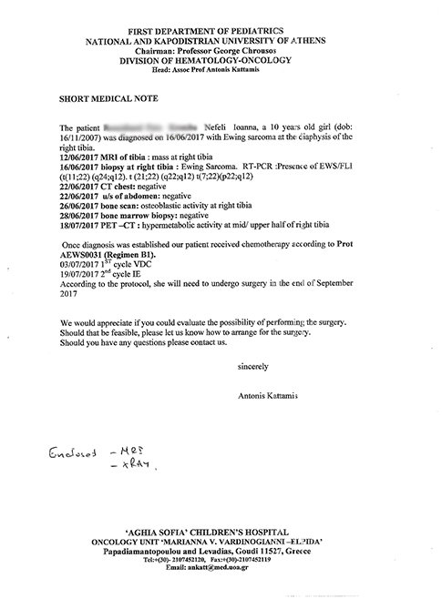 Μάλιστα, ο θεράπων ιατρός επικοινώνησε ο ίδιος με το Κέντρο στην Ιταλία και τους ζήτησε να δεχτούν να χειρουργήσουν το παιδί και μάλιστα το αργότερο έως τα τέλη Σεπτεμβρίου, λόγω του επείγοντος της μορφής της νόσου.