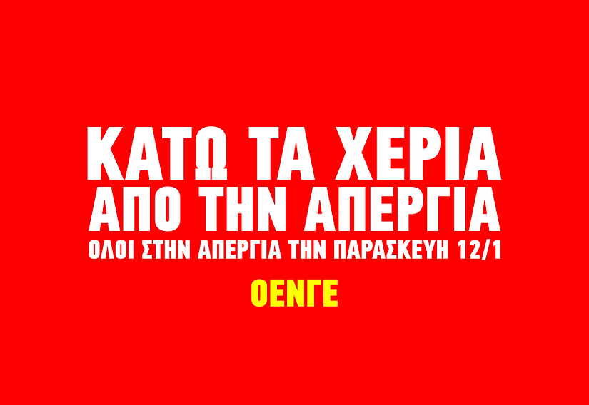Η ΟΕΝΓΕ παίρνει θέση μάχης και συντάσσεται στον αγώνα μαζί με τα σωματεία, τις Ομοσπονδίες του Δημόσιου και του Ιδιωτικού τομέα, τα Εργατικά Κέντρα που έχουν προκηρύξει απεργία, την Παρασκευή 12/1, ημέρα κατάθεσης στην Ολομέλεια της Βουλής του πολυνομοσχεδίου. Κόντρα σε όλους όσους βάζουν εμπόδια και υπονομεύουν με κάθε τρόπο τους αγώνες μας. Δίνουμε το αγωνιστικό «παρών» στην απεργία και στις απεργιακές συγκεντρώσεις την Παρασκευή. Παίρνουμε μέρος στις καθημερινές αγωνιστικές πρωτοβουλίες ως και τη μέρα που θα φέρουν προς ψήφιση τα νέα μέτρα.
