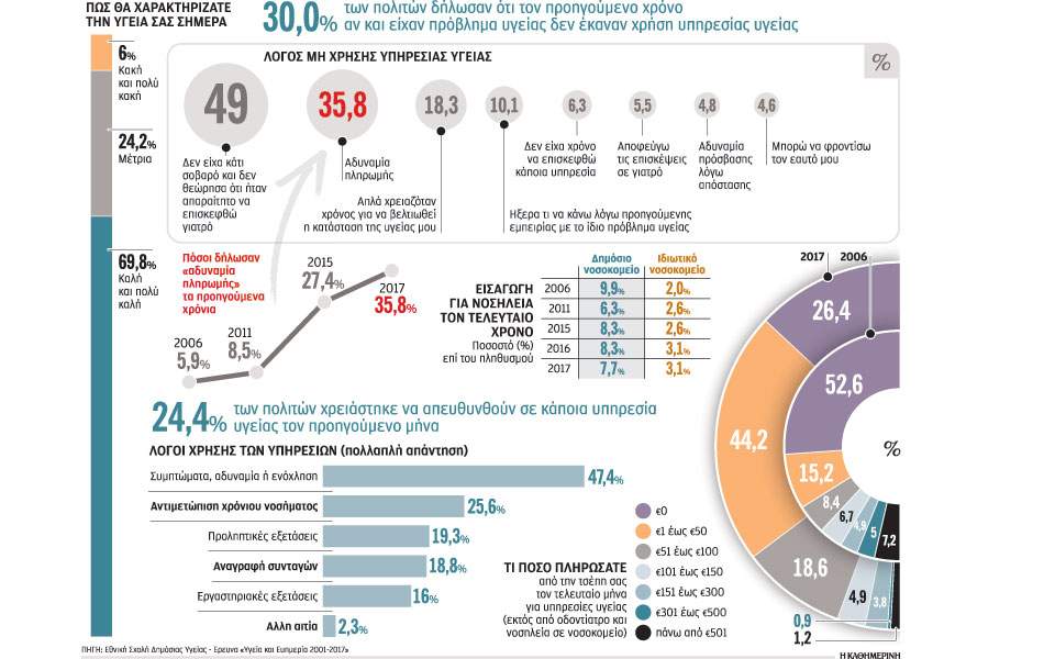 Τρεις στους δέκα που αντιμετώπισαν κάποιο πρόβλημα υγείας τον τελευταίο χρόνο επέλεξαν να μην πάνε στον γιατρό, περιμένοντας «να περάσει» ο πόνος. Το 35,8% αυτών δήλωσε ότι ο λόγος για τον οποίο δεν πήγε στον γιατρό είναι το κόστος των υπηρεσιών. Το ποσοστό αυτό έχει σημαντικά αυξηθεί σε σχέση με το 2006, όταν αδυναμία πληρωμής δήλωνε μόλις το 5,9% όσων επέλεξαν να μην απευθυνθούν σε υπηρεσία υγείας.