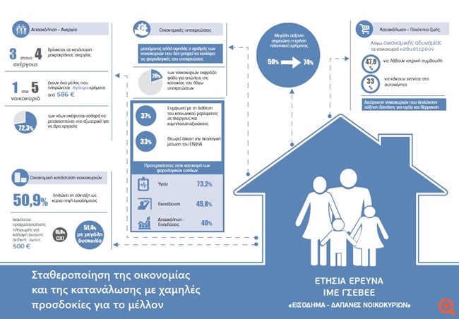 Εξέλιξη η οποία συνδέεται άμεσα και με την αγορά εργασίας στη χώρα. Σήμερα το 29,9% των νοικοκυριών, δηλαδή περίπου 1 εκατ. νοικοκυριά, έχουν στην οικογένεια ένα τουλάχιστον άτομο σε ανεργία. Με το ποσοστό της μακροχρόνιας ανεργίας να ανέρχεται στο 83,5% του συνολικού αριθμού των ανέργων. Στο σύνολο των άνεργων μελών των νοικοκυριών, το ποσοστό που λαμβάνει επίδομα ανεργίας περιορίζεται στο 7,3% (το χαμηλότερο από την πρώτη μέτρηση).