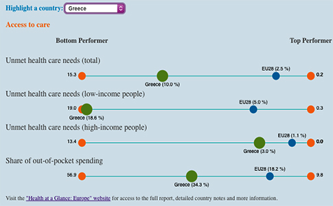 Ενδεικτική της ανισότητας είναι η παρακάτω σύγκριση μεταξύ της Ελλάδας και ευρωπαϊκών χωρών στα ποσοστά του πληθυσμού που έχουν ακάλυπτες ανάγκες περίθαλψης: