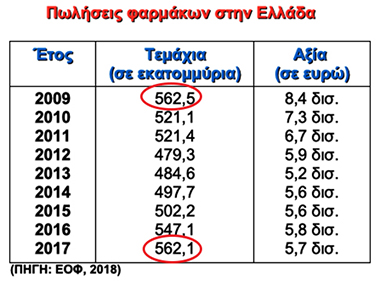 Η Πολιτεία αδιαφορεί για τον έλεγχο της ζήτησης και – όπως δείχνει ο παρακάτω πίνακας – η κατανάλωση φαρμάκων έχει φτάσει ξανά στα επίπεδα του 2009. Φροντίζει μόνο να μειώνει τις τιμές και τις πληρωμές της, ζητώντας από ασθενείς και τις εταιρείες να πληρώσουν τη διαφορά.