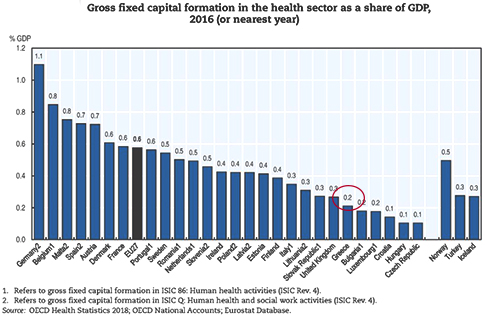 Η χώρα μας διαθέτει για υποδομές Υγείας το 0,2% του ακαθάριστου εγχώριου προϊόντος (ΑΕΠ). Η μείωση σε σχέση με την προ κρίσης περίοδο είναι πολύ μεγαλύτερη, αν αναλογιστούμε πως το ΑΕΠ έχει υποχωρήσει τα τελευταία χρόνια κατά 25%.