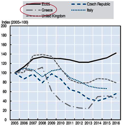 Είναι ενδεικτικό πως οι επενδύσεις το 2016 ήταν λιγότερες από τις μισές που είχαν γίνει το 2005, υποχωρώντας κατά 25% τη διετία 2012 – 2013.