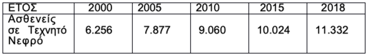 Τα επίσημα στοιχεία της Υπηρεσίας Συντονισμού και Ελέγχου, που δίνουν στη δημοσιότητα οι κλινικάρχες των μονάδων αιμοκάθαρσης, αποτυπώνουν τηναύξηση των υποβληθέντων σε τεχνητό νεφρό στην χώρα μας, ως εξής: