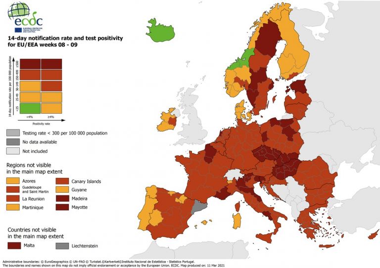 Στη δημοσιότητα δόθηκαν για αυτή την εβδομάδα από το Ευρωπαϊκό Κέντρο Πρόληψης & Ελέγχου Νόσων οι αναθεωρημένοι έγχρωμοι χάρτες που αποτυπώνουν την επιδημιολογική εικόνα στα κράτη μέλη της ΕΕ.