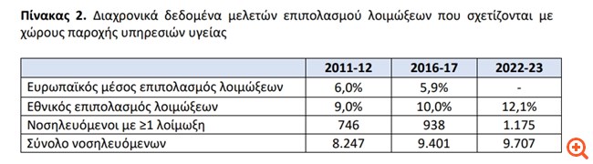 Όπως μάλιστα αναφέρεται στην έκθεση του ΕΟΔΥ, η Ελλάδα κατέχει διαχρονικά υψηλή θέση στην ευρωπαϊκή κατάταξη. Το 2011-12 ο ευρωπαϊκός μέσος όρος ήταν 6,0% (εύρος χωρών: 2,3% - 10,8%) με τη χώρα να βρίσκεται στην 4η θέση, ενώ το 2016-17 η Ευρώπη κατέγραψε μέσο επιπολασμό λοιμώξεων 5,9% (εύρος χωρών: 2,9% - 10,0%) με την Ελλάδα να βρίσκεται στην 1η θέση. Την περίοδο 2022-23, ο επιπολασμός των λοιμώξεων στην Ελλάδα αναμένεται να παραμένει σημαντικά μεγαλύτερος από τον ευρωπαϊκό μέσο όρο.