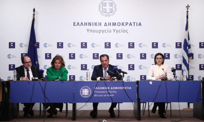 Στη συνέντευξη Τύπου στο Υπουργείο Υγείας παρίσταται η Αναπληρώτρια Υπουργός Ειρήνη Αγαπηδάκη, ο Προέδρος του ΕΟΔΥ καθηγητής Χρήστος Χατζηχριστοδούλου και η Καθηγήτρια Πνευμονολογίας Εντατικής Θρεραπείας, Αναστασία Κοτανίδου .