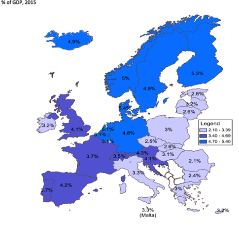 Παρά τις μείζονες επιπτώσεις που προκαλεί η (μόνιμη πλέον) οικονομική κρίση, η χώρα μας βρίσκεται σαφώς κάτω από τον ευρωπαϊκό μέσο όρο: δαπανά το 3,01% του ακαθάριστου εγχώριου προϊόντος (ΑΕΠ), έναντι μέσου ποσοστού 4,1% στην Ευρωπαϊκή Ένωση των “28”.