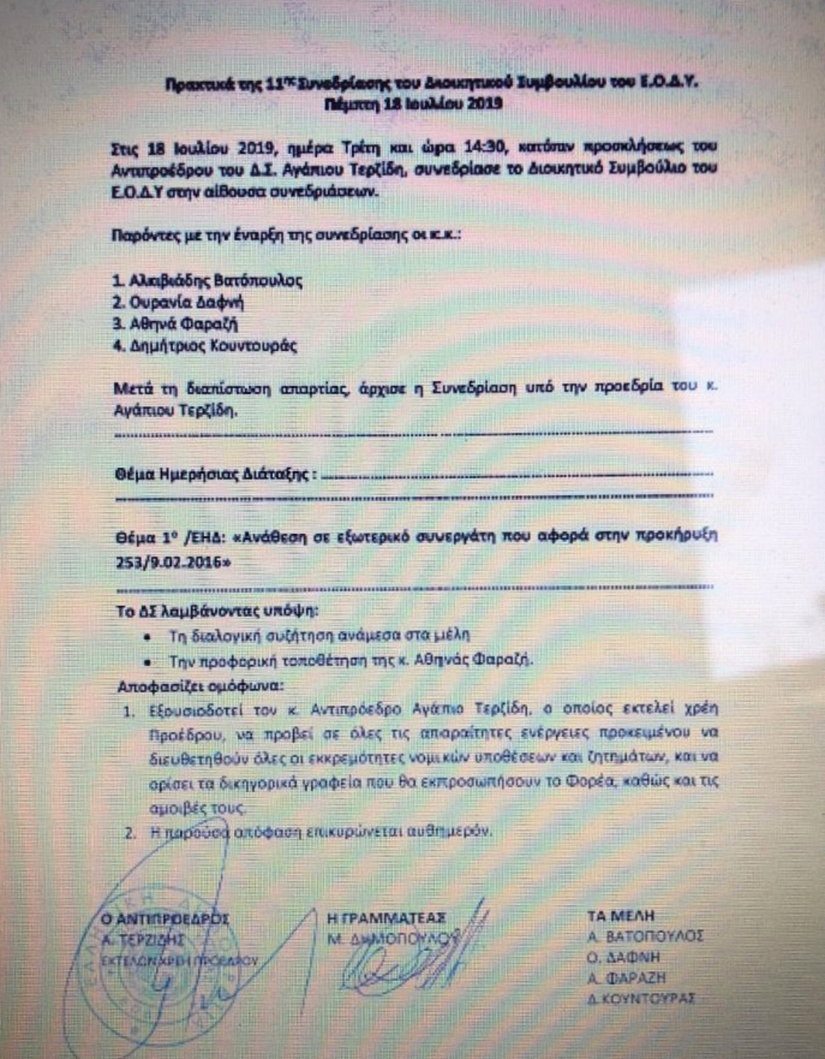 Κατά την συνεδρίαση του την Πέμπτη 18 Ιουλίου 2019 (δέκα ημέρες μετά τις εθνικές εκλογές), το Δ.Σ. του ΕΟΔΥ (πρ. ΚΕΕΛΠΝΟ) αποφάσισε να εξουσιοδοτήσει τον αντιπρόεδρο κ. Αγάπιο Τερζίδη -ο οποίος εκτελεί χρέη προέδρου μετά την παραίτηση Ρόζενμπεργκ- “να προβεί σε όλες τις απαραίτητες ενέργειες προκειμένου να διευθετηθούν όλες οι εκκρεμότητες νομικών υποθέσεων και ζητημάτων και να ορίσει τα δικηγορικά γραφεία που θα εκπροσωπήσουν το Φορέα, καθώς και τις αμοιβές τους”, όπως αποκαλύπτει έγγραφο που δημοσιεύει το tomanifesto.gr.
