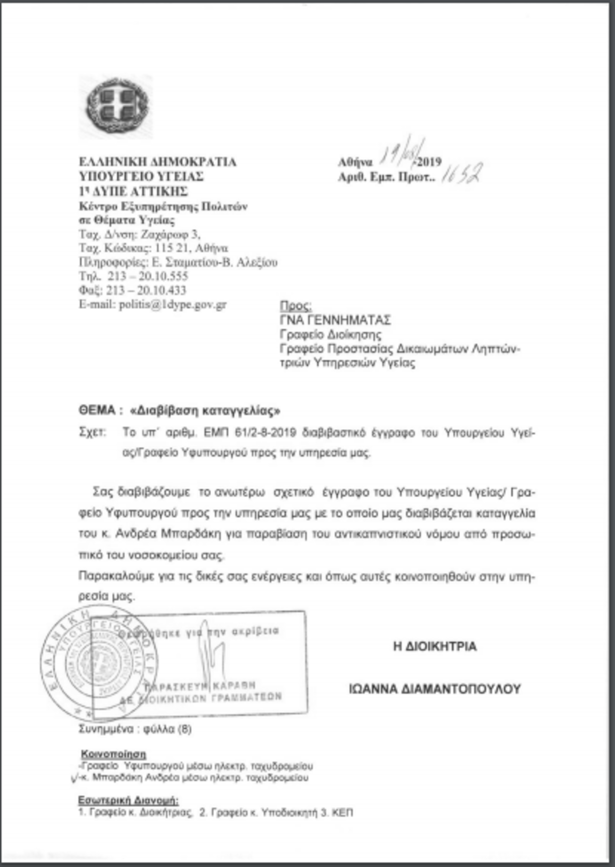 Την ίδια στιγμή, με παρέμβασή του ο υφυπουργός Υγείας, Βασίλης Κοντοζαμάνης ζητά από την Διοίκηση της 1ης ΔΥΠΕ να μεταβιβάσει στις Διοικήσεις του Γενικού Κρατικού Νοσοκομείου “Γ.Γεννηματάς”, και του Κωνσταντοπούλειου Νοσοκομείου Πατησίων την εντολή να προβούν σε όλες τις απαραίτητες ενέργειες, σχετικά με τις προηγούμενες καταγγελίες για κάπνισμα γιατρών και νοσηλευτών εντός νοσοκομείων,που έγιναν στην ίδια διαδικτυακή ομάδα του ακτιβιστή Ανδρέα Μπαρδάκη και τις οποίες έφερε στο φως της δημοσιότητας στις 6 Αυγούστου, το iatropedia.gr