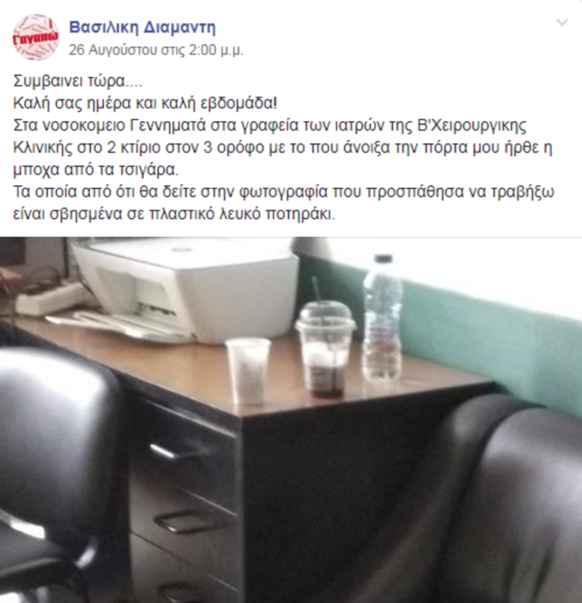 Το νέο περιστατικό σημειώθηκε, σύμφωνα με την καταγγέλουσα Βασιλική Διαμάντη, στα γραφεία των γιατρών της Β΄ Χειρουργικής Κλινικής του Γενικού Κρατικού Νοσοκομείου “Γ.Γεννηματάς”, που βρίσκονται στο 2ο κτίριο, στον 3ο όροφο. 'Οπως αναφέρει η ίδια σε ανάρτησή της στην διαδικτυακή σελίδα της η ακτιβιστική ομάδα “STOP στο παθητικό κάπνισμα”, με το που άνοιξε την πόρτα του γραφείου των γιατρών της ήρθε “η μπόχα από τα τσιγάρα”. Πάνω στο γραφείο βρίσκονταν πλαστικά ποτήρια γεμάτα με αποτσίγαρα. Μόλις κατάφερε να βγάλει το κινητό της και να τραβήξει την παρακάτω φωτογραφία.