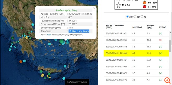 Ο ισχυρός σεισμός ήταν 6,7 της κλίμακας Ρίχτερ σύμφωνα με το Γεωδυναμικό. Στην αναθεωρημένη ενημέρωσή του το Γεωδυναμικό Ινστιτούτο αναφέρει ότι το επίκεντρο του σεισμού ήταν 17 χλμ. Βόρεια της Σάμου (νωρίτερα ανέφερε ότι το επίκεντρο ήταν στη θαλάσσια περιοχή 19 χλμ. βόρεια βορειοδυτικά της Σάμου), σε εστιακό βάθος 11,8 χλμ. (έναντι εστιακού βάθους 2 χλμ. που ανέφερε νωρίτερα).