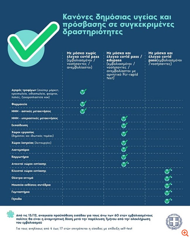 - Το πιστοποιητικό εισόδου σε κλειστούς χώρους για εμβολιασμένους άνω των 60 ετών παύει να ισχύει επτά μήνες από την έκδοσή του. Θα δοθεί, δηλαδή, ένας μήνας περιθώριο για τον εμβολιασμό τους με την 3η δόση μετά την πάροδο του εξαμήνου.