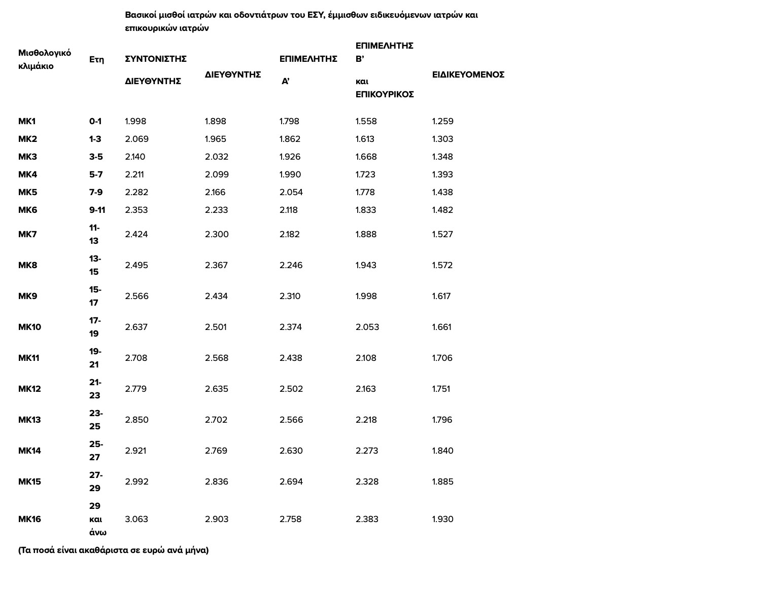 2 Ο μηνιαίος βασικός μισθός του Μ.Κ.1 του Συντονιστή Διευθυντή ορίζεται στο ποσό των 1.998 ευρώ. Ο βασικός μισθός των επόμενων μισθολογικών κλιμακίων μέχρι το Μ.Κ. 16 διαμορφώνεται με πρόσθεση στο αμέσως προηγούμενο Μ.Κ. του ποσού των 71 ευρώ.